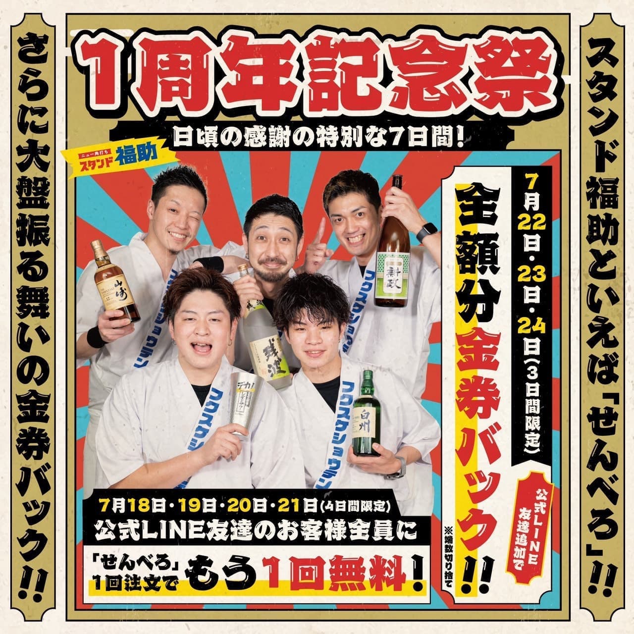 日頃のご愛顧にお返しをさせて頂きたく、7/18(祝月)より「スタンド福助1周年記念祭」を1週間の期間限定で開催します。