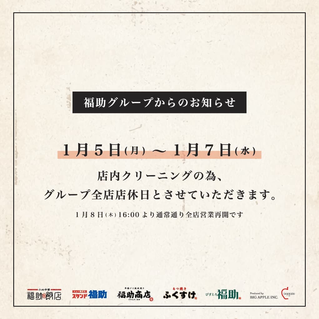 誠に勝手ながら1月5日(月)/1月6日(火)/1月7日(水)は店内クリーニングの為、全店店休日とさせていただきます。